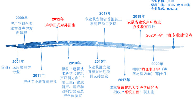 安徽建筑大学声学专业2012年首次面向全国招收本科生,2015年获批安徽省振兴计划项目支持建设,2017年获安徽省首批新工科建设项目支持,2019年获批安徽省建筑声环境重点实验室,2020年获安徽省一流专业建设点。