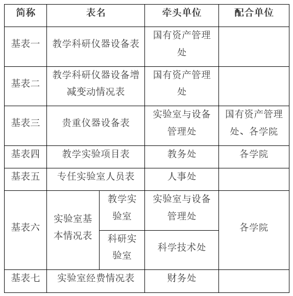 2.各学院应按照附件3《贵重仪器设备表》(SJ3)和附件4《实验室基本情况表》(SJ6)准确填报相关数据。其中,《贵重仪器设备表》(SJ3)报送实验室与设备管理处;《实验室基本情况表》(SJ6)的教学实验室信息报送实验室与设备管理处汇总,科研实验室信息报送科学技术处汇总。