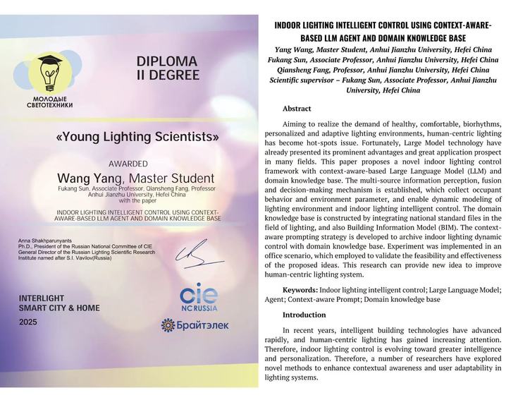 本网讯 近日,在国际照明委员会(International Commission on Illumination,CIE)及俄罗斯国家委员会(CIE NC RU)联合举办的“Young Lighting Scientists”竞赛中,我校双碳研究院方潜生教授团队荣获青年科学家奖。2024级新一代电子信息技术专业硕士生汪阳凭借《INDOOR LIGHTING INTELLIGENT CONTROL USING CONTEXT-AWARE-BASED LLM AGENT AND DOMAIN KNOWLEDGE BASE》研究成果参与评奖,方潜生教授(通讯作者)与孙富康副研究员担任指导老师。