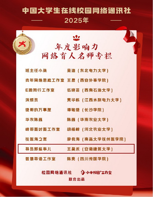 本网讯 12月25日,中国大学生在线正式发布2025年度影响力网络育人名师专栏名单,安徽建筑大学专职辅导员运营的专栏号“导员那些事儿”成功入选,也是安徽省唯一上榜高校,彰显了学校在打造“线上、线下”两个平台,形成“同向同行、同频共振”育人合力的积极探索与突出成效。