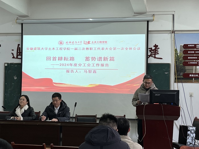 学院党委副书记、分工会主席马智鑫作“回首耕耘路 蓄势谱新篇”——2024年度学院分工会工作报告。报告总结了过去一年学院以党建带工建,强化思想引领;开展师德建设,筑牢教职工精神根基;推进教职工队伍建设改革,助力职工建功立业;大力支持科研创新,搭建平台收获丰硕科研立项成果;围绕学校中心工作维护教职工权益,构建和谐校园,并开展多样文体活动提升教职工幸福指数等内容。同时对下一步工作进行了详细地规划与部署。