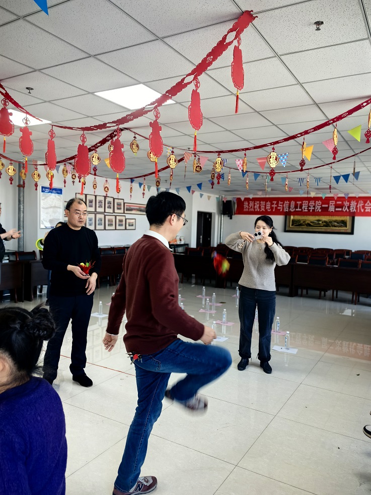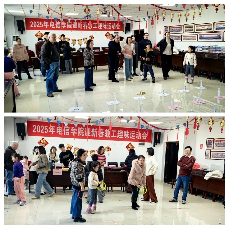 本网讯 为庆祝龙年新春佳节,丰富教职工的业余文化生活,增强学院凝聚力,电信学院于2025年1月16日在学院会议室成功举办了“迎新春-教职工趣味运动会”。活动内容包括套圈、夹玻璃球、计时跳绳、踢毽子以及“摇摇乐”等多项趣味项目,吸引了众多教职工积极参与,现场气氛热烈非凡。