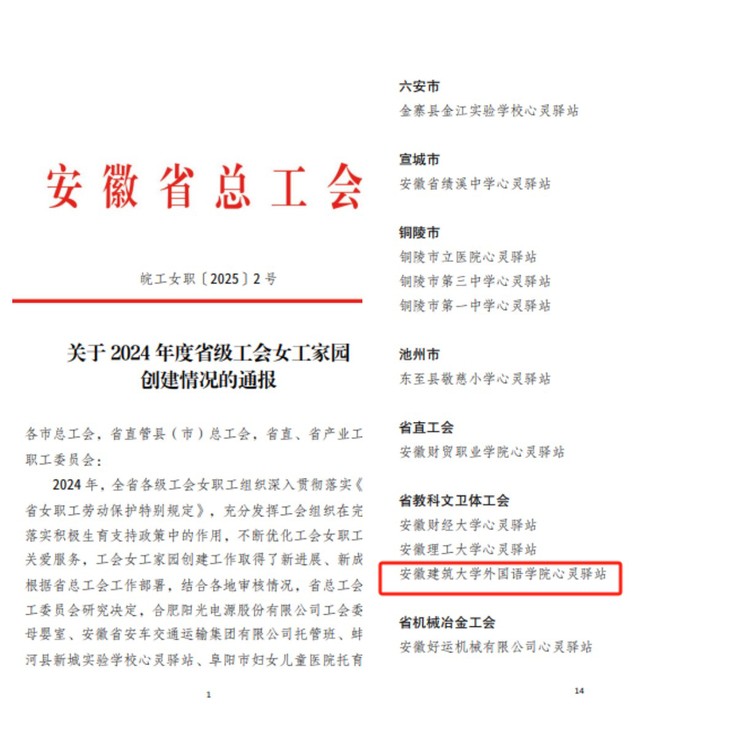 本网讯 春日传佳讯,耕耘结硕果。近日,安徽省总工会2024年度评优结果揭晓,安徽建筑大学外国语学院心灵驿站荣获省级工会女工家园称号。这支女性教职工占比76%的团队,用温暖服务与创新实践,书写了新时代高校女工工作的生动篇章。