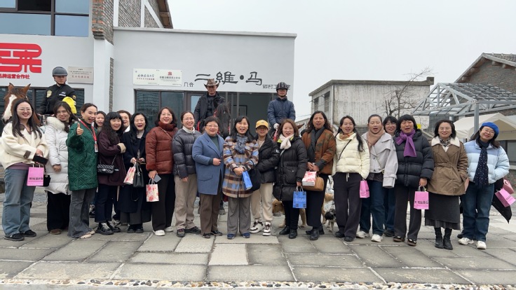 女教师们走进马郢村安徽建筑大学艺术学院非遗文创美育工作室(马郢工作站),观赏王河舒席、徽笔、宋锦、绒花、望江挑花等十余项非遗展品,近距离感受传统工艺的精妙匠心。在马郢村“清风明月”手作工坊,女教师们沉浸式体验非遗绒花制作。非遗传承人现场演示分丝、染色、勾条、打尖等工序,指导大家将蚕丝化为灵动花饰。每一片花瓣都凝聚着匠心,让我们触摸到传统文化的温度。活动特别设置“师者风韵”肖像创作环节,艺术学院2022级动画专业学生张婷婷现场为女教师手绘肖像。她以细腻笔触精准捕捉老师们的个性特质,惟妙惟肖的画作赢得阵阵掌声。在田园茶室,大家伴着古筝和箫悠扬的旋律品茶,分享非遗创作感悟。马郢村凡辰马会的三匹骏马惊喜亮相,与女教师们亲切互动,为节日增添灵动生机。
