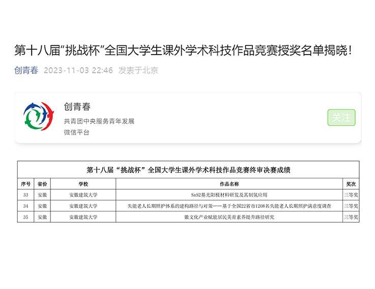 本网讯 近日,由共青团中央、中国科协、教育部、中国社会科学院、全国学联和贵州省人民政府共同主办的第十八届“挑战杯”全国大学生课外学术科技作品竞赛终审决赛在贵州大学举行。安徽建筑大学入围主体赛决赛,经过激烈角逐,最终荣获三项国家级奖项,七项省级一等奖,实现了学校在该项竞赛中的新突破。