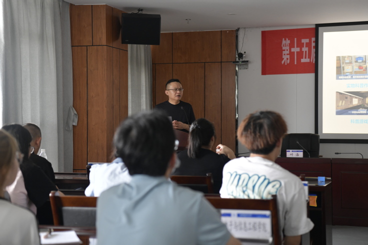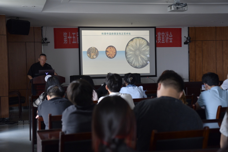 叶浩对本次“双百”大赛的赛事内容和创作要求进行了系统讲解,并为同学们从科普作品的分类、选题方向进行了详细解读。张燕翔从作品创意设计的思路和方法,针对不同类别的参赛作品进行了创作指导,向同学们详细介绍了往届优秀获奖作品的亮点分析。在展示往届大赛获奖作品的环节,会议的气氛瞬间变得热烈而专注,学生们的目光被一件件创意十足、设计精良的作品深深吸引。在宣讲会现场互动提问环节,学生踊跃提问,叶浩、张燕翔从作品选题、创作思路、作品表现形式等方面一一作答,与我校学生亲切交流,加深了广大师生对大赛的理解,为校内科普创新的氛围营造起到了积极的推动作用。