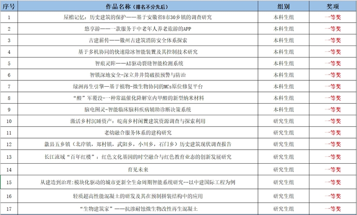 根据《关于举办安徽建筑大学第十一届“挑战杯”大学生课外学术科技作品竞赛的通知》相关文件要求,经前期动员、学院推荐、专家评审等环节,现将本次竞赛获奖情况予以公示。