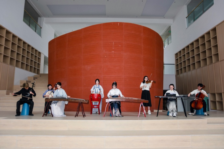 经纬书院内,传统曲艺魅力尽显。同学们表演的相声以字正腔圆的贯口、默契十足的捧逗,让书院回廊萦绕着浓郁的艺术气息。朗诵俱乐部在书院内,字斟句酌打磨台词讨论剧本,深切感受语言艺术的独特魅力。与此同时,民乐俱乐部成员指尖灵动,音符如涟漪在庭院水池中散开,与书香墨韵相融,绘就一幅雅致的文化图景,情景剧俱乐部在校史馆,依托馆藏文献资料,深入挖掘校史故事,找寻厚重的校史记忆,以“沉浸式”创作表达对学校深厚的感情。摄影穿梭各活动现场,用镜头定格美育实践的精彩瞬间。