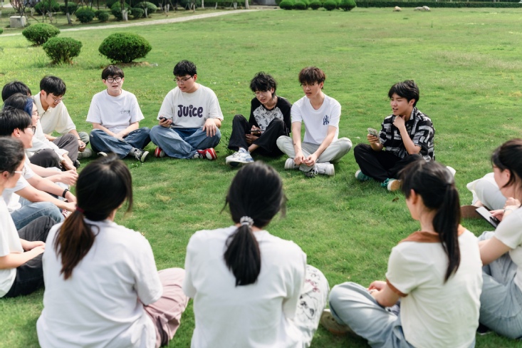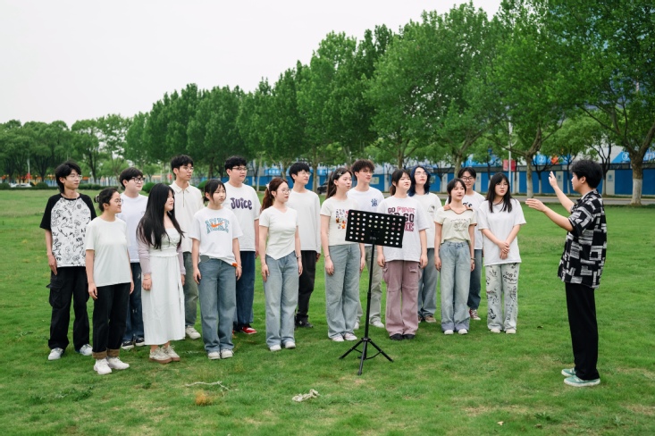 校园草地化身为露天剧场,合唱队以蓝天为幕、绿草为席,悠扬歌声吸引众多师生驻足聆听。大家席地而坐,在微风中共享艺术之美,整个校园洋溢着欢快氛围。