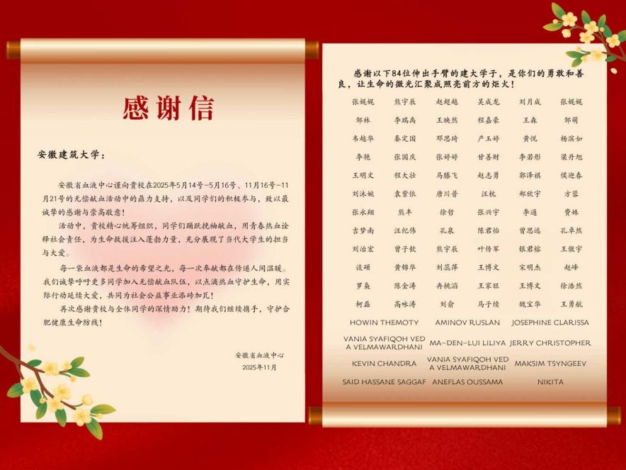 本网讯 近日,安徽省血液中心向安徽建筑大学发来感谢信,信中对我校在2025年度两场无偿献血活动中的全力支持与师生踊跃参与,致以由衷感谢与崇高敬意,字里行间满是对安建大学子公益担当的认可。