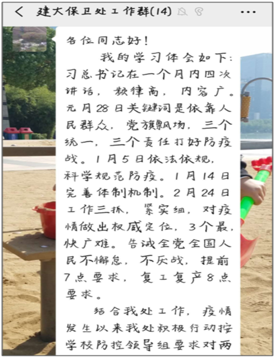 结合基层党支部建设标准,保卫处党支部将每月第四周的周二上午定为政治学习,学习内容与学校党委中心组学习内容相结合,及时传达学习国家路线、方阵、政策以及各项规章制度。为严格落实学校关于疫情防控的相关规定,保卫处党支部将近期习近平总书记关于疫情防控的相关讲话、批示等内容进行整理,通过部门微信群发送至支部全体党员,组织大家自学,并及时进行学习心得和体会的交流,通过具体的措施,进一步坚定大家打赢疫情阻击战的决心和信心。