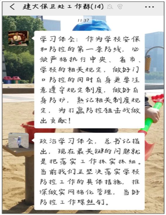 自疫情发生以来,保卫处全体工作人员坚持在岗值守,按照“六个一律”的具体要求落实校园封闭管理和人员查验工作,同时尽可能的为教职工提供热心周到的服务,体现了严管和厚爱并存的管理模式,通过实际行动践行“不忘初心、牢记使命”的宗旨,让党旗始终飘扬在防控疫情的第一线。