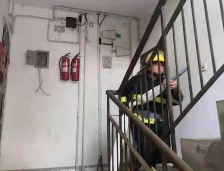 “事发地点是在6楼吗?里面是什么情况?有无人员被困?什么东西起火?有没有断电?”挂断接警电话,站内消防警铃骤然响起,队员们熟练的穿起了灭火服,快速驾驶巡逻车辆驶向了事发地点。消防队长魏雪双催促道“快下车,铺设水带干线。”,队员赵继超和胡云龙负责外围警戒,韦玮和葛军龙铺设水带干线直达四楼,魏雪双和张国强拿着水枪和水带冲向四楼连接水带。水带连接完毕,观察完火点后,“开水!”。火点扑灭后,队员赵继超说道“原来是个演练啊,紧张死我了”。