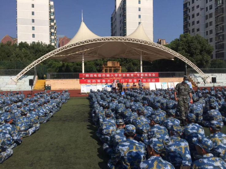 本网讯  2021年9月18日,保卫处联合包河公安分局和包河区反诈中心,在北校区组织2021级新生进行防范诈骗安全知识报告会和我的青春不“毒”行的禁毒宣传活动。