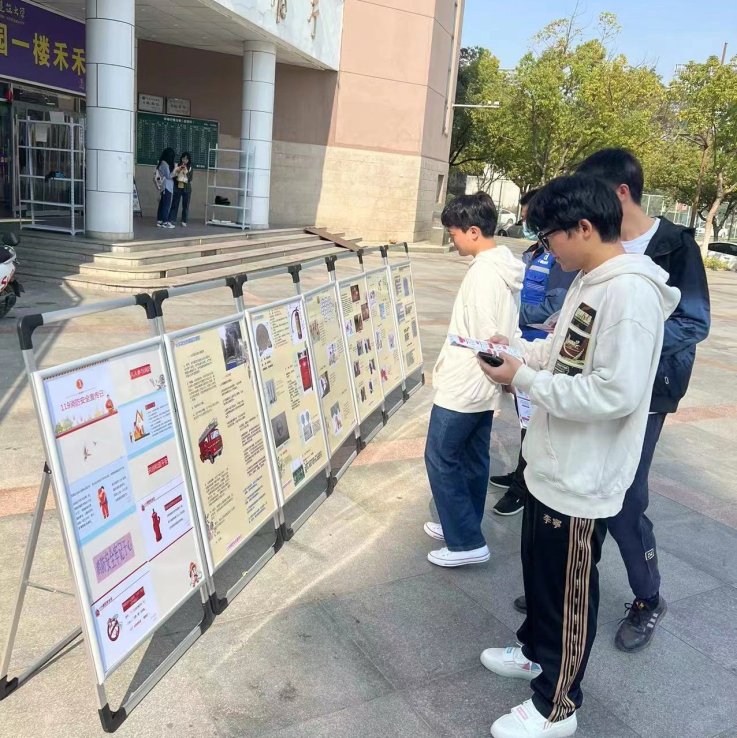 上午,保卫处在南北校区食堂外设置消防宣传主题展板,详细介绍日常防火常识和紧急情况下逃生自救要点。
