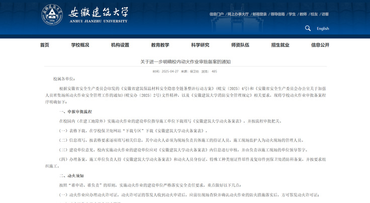 本网讯 为贯彻落实《安徽省建筑保温材料安全隐患全链条整治行动方案》(皖安〔2025〕4号)和《安徽省安全生产委员会办公室关于加强人员密集场所动火作业安全管理工作的通知》(皖安办〔2025〕2号)《关于人员密集场所加强动火作业安全管理的通告》(消防〔2025〕20号)文件精神,并结合《安徽建筑大学消防安全管理规定》相关规定,学校通过“审批备案+现场公示”双举措,构建校园动火作业安全管理体系,切实防范消防安全风险。