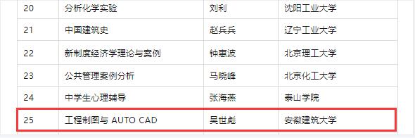 本网讯 近日,教育部在线教育研究中心公示了2023年“拓金计划”项目全年入选课程名单,项目面向国内高校共计遴选34门课程,材化学院吴世彪教授主持的《工程制图与AUTO CAD》线上课程入选。这是材化学院《土木工程材料》获国家级一流课程后,在课程建设上取得了又一新进展。