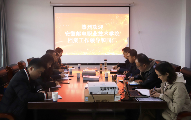 本网讯 1月5日,安徽邮电职业技术学院党委书记阎立率教务处、学生处、办公室主要负责人等一行六人来校调研考察,双方就高校档案工作展开会谈与交流。副校长蔡国军接待了阎立一行。机关第二党委、学生处、财务处等相关职能部门主要负责人参加交流座谈。