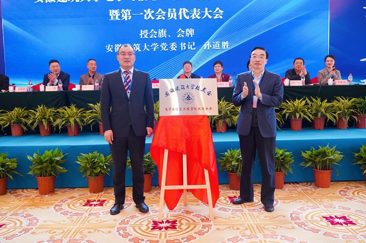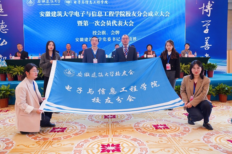 校党委书记、校友会会长孙道胜和电子与信息工程学院党委书记、校友分会会长孙长城共同为电子与信息工程学院校友分会揭牌和授旗。出席领导为安徽建筑大学电子与信息工程学院校友分会第一届理事会会长、副会长、秘书长、监事长、监事颁发聘书。