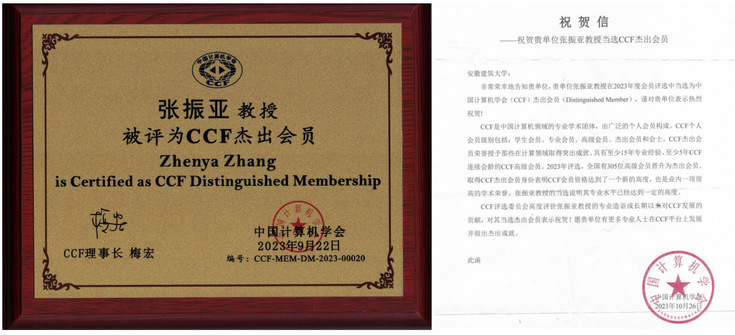 本网讯 日前,中国计算机学会(CCF)向安徽建筑大学发来贺信:祝贺我校电子与信息工程学院张振亚教授当选CCF杰出会员。CCF评审委员会高度评价了张振亚教授的专业造诣和长期以来对CCF发展的贡献,并对其当选杰出会员表示热烈祝贺。