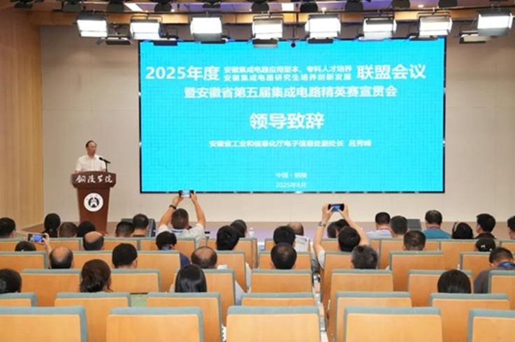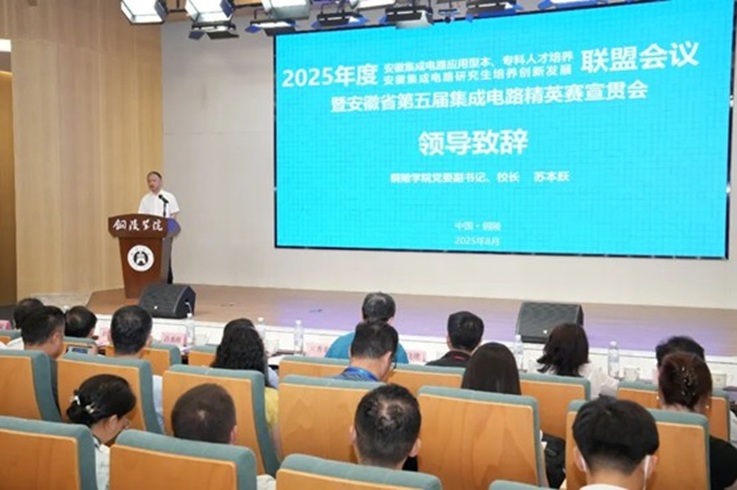 本网讯 8月7日至8日,由安徽集成电路应用型本、专科人才培养联盟、安徽集成电路研究生培养创新发展联盟、合肥国家“芯火”双创平台、安徽省半导体行业协会主办,铜陵学院承办,合肥工业大学、安徽大学、安徽建筑大学、合肥师范学院、安徽省仪器仪表学会、合肥芯火职业技能培训学校有限公司协办的2025年度安徽集成电路应用型本、专科人才培养联盟、安徽集成电路研究生培养创新发展联盟暨安徽省第五届集成电路精英赛宣贯会在铜陵顺利召开。本次大会邀请到省工业和信息化厅电子信息处副处长吕秀峰,铜陵学院校党委副书记、校长苏本跃教授,安徽省集成电路人才培养联盟理事长陈军宁,联盟常务副理事长等出席开幕式。来自省内高校、企业科研机构八十余位代表出席了会议。