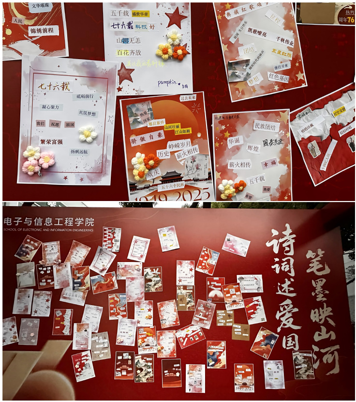 本次活动以“诗词述爱国・笔墨映山河”为主题,创新采用“拼贴诗” 形式,将国庆的庄重意蕴与诗歌的文学之美、传统文化的深厚底蕴紧密结合。活动现场精心准备了印有经典爱国诗句、山河意象(如 “长城”“黄河”“江南”)、时代发展关键词(如 “科技兴邦”“生态文明”“乡村振兴”)的词句碎片。此次活动形式新颖,内容丰富,吸引了众多师生驻足,更得到了领导和老师的充分肯定。