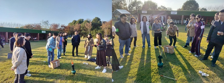 本次户外活动的核心环节围绕“寻趣”与“协作”展开。设置了“飞盘掷准”“你画我猜”“投壶”和“线上滚球”一系列需要紧密配合的挑战项目。在“线上滚球”中,队员们需要在规定时间内紧紧拉住绳索,同心协力让球在绳索上顺利滚动到目标地,考验的是团队的默契与节奏;在“你画我猜”中,大家争分夺秒,集思广益,共同破解图片谜题,展现了卓越的沟通与协作能力。活动现场,加油声、呐喊声、欢笑声此起彼伏,每一位参与者都全情投入,为了共同的目标而努力。平日里在讲台上严谨授业的教授,在办公室伏案工作的行政人员,此刻都化身为矫健的队员,在合作与竞争中释放激情,在绿水青山间展现了别样的风采。