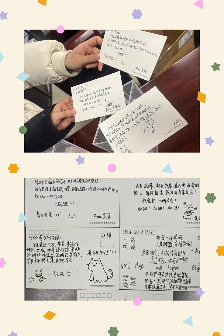 活动筹备阶段,支部23级党员同学踊跃参与,精心挑选祝福素材。学弟学妹们在明信片上写下专属寄语,“路虽远行则将至,事虽难做则必成”、“窗外有风景,笔下有前途”,一句句暖心话语、一个个加油符号,饱含着对学长学姐的们美好期许。同时,支部精心准备了考研大礼包,学弟学妹们分组来到考研自习室,将满载祝福的明信片和大礼包逐一送到学长学姐手中,赠送现场暖意融融,收到礼物的考研学子们脸上洋溢着惊喜,纷纷表示这份突如其来的温暖让自己非常感动,也更有动力坚持到底。