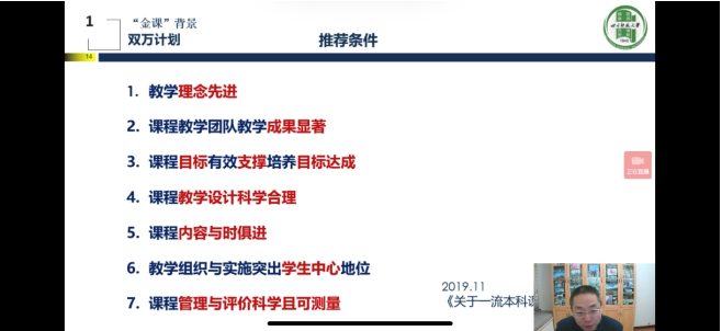 本次培训围绕课程思政、课前-课中-课后课程建设与运行、教学方法改革、金课申报等方面详细阐述,并用大量的课程教学案例深入探讨线上线下混合式一流课程和线下一流课程建设和申报。