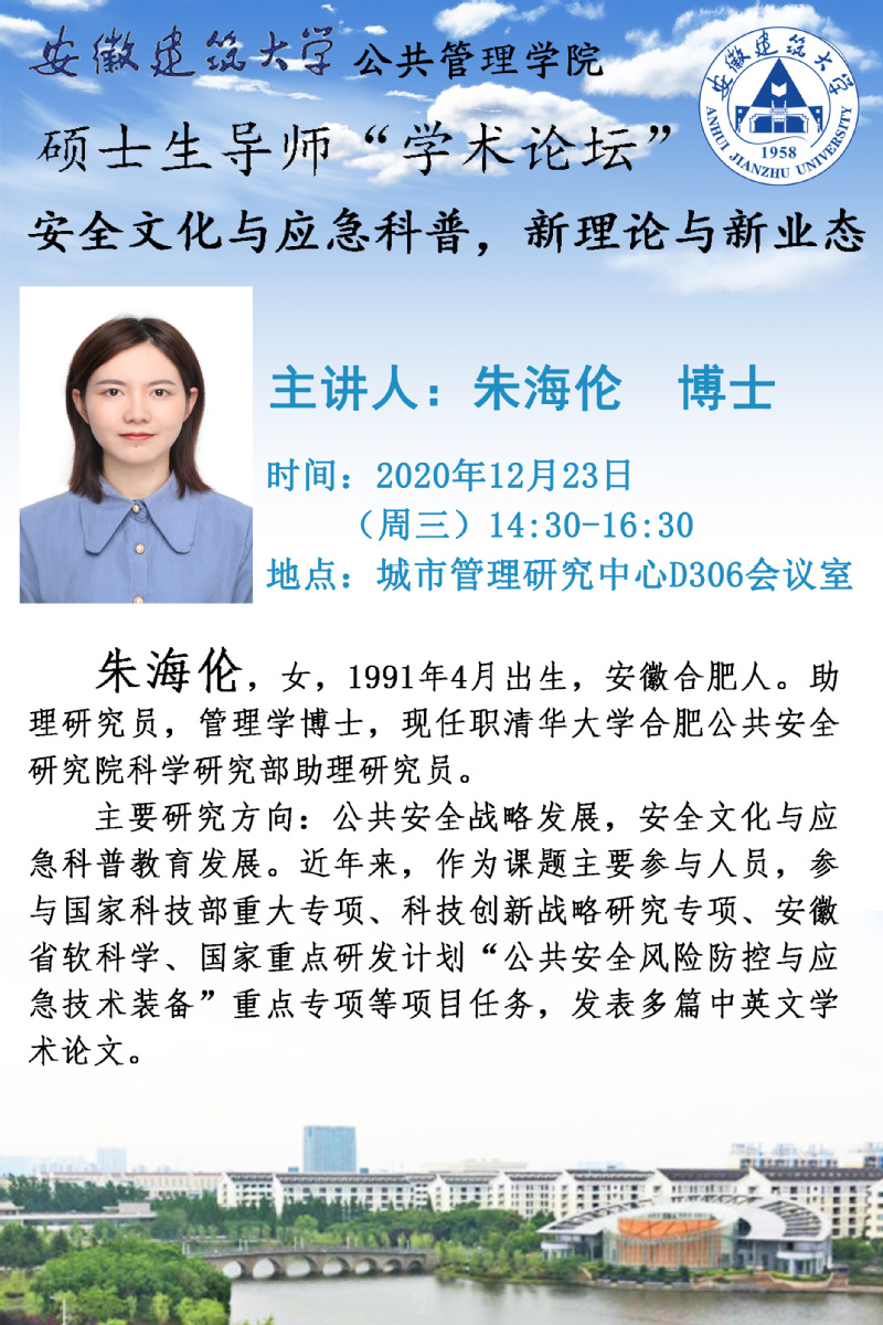 本网讯 12月23日下午,公管学院在南校区主教楼1712会议室顺利开展第六期硕士生导师学术讲座,全体硕士研究生参加本次论坛。清华大学合肥公共安全研究院的朱海伦博士担任本次主讲嘉宾,讲座主题为《安全文化与应急科普:新理论与新业态》。