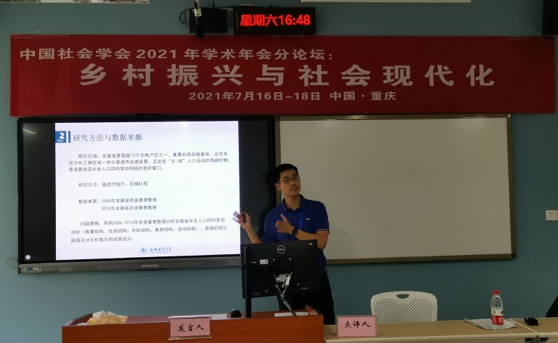 据悉,中国社会学会2021年学术年会是由中国社会学会主办的全国性学术年会。本次“乡村振兴与社会现代化”分论坛共收到投稿论文52篇,经过安徽省社会学学会学术委员会评审共选出10位嘉宾现场发言,按照10%的推荐比例向大会推荐了5篇优秀论文。分论坛的圆满举办有效提升了我院的社会影响力,为学院青年博士提供了与其他高校学者对话交流的平台,也极大丰富了我院研究生培养工作。(文/图:马婕菲;指导老师:蔡弘;审稿:黄佳豪)