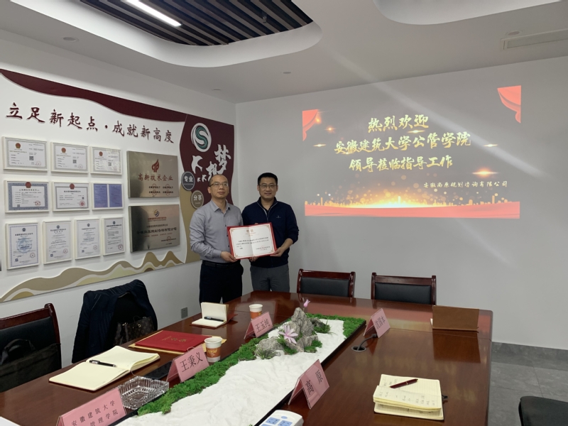 本网讯 为加强学术型研究生实践培养,构建开放式研究生培养体系,拓宽产学研合作渠道,5月16日-17日,公管学院副院长黄佳豪一行5人先后前往安徽尚原规划咨询有限公司、合肥润田规划设计有限公司和安徽乐庭健康科技产业集团开展学术型硕士研究生兼职实务导师聘任活动。