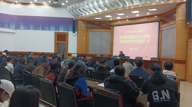 本网讯 为庆祝党的二十大胜利召开,引导广大青年学生深入学习贯彻党的二十大精神,鼓励广大师生在新时代城市管理工作中建功立业,11月23日,公管学院在北校区F楼3楼报告厅举办公共管理前沿论坛第1期暨二十大精神解读报告会,邀请校党委常委、副校长蔡新立教授主讲“学习贯彻党的二十大精神,深化新时代城市管理工作”的学术报告。公管学院院长黄佳豪主持,学院党政领导班子、相关专业系教师及城市管理等专业同学共160余人参加活动。