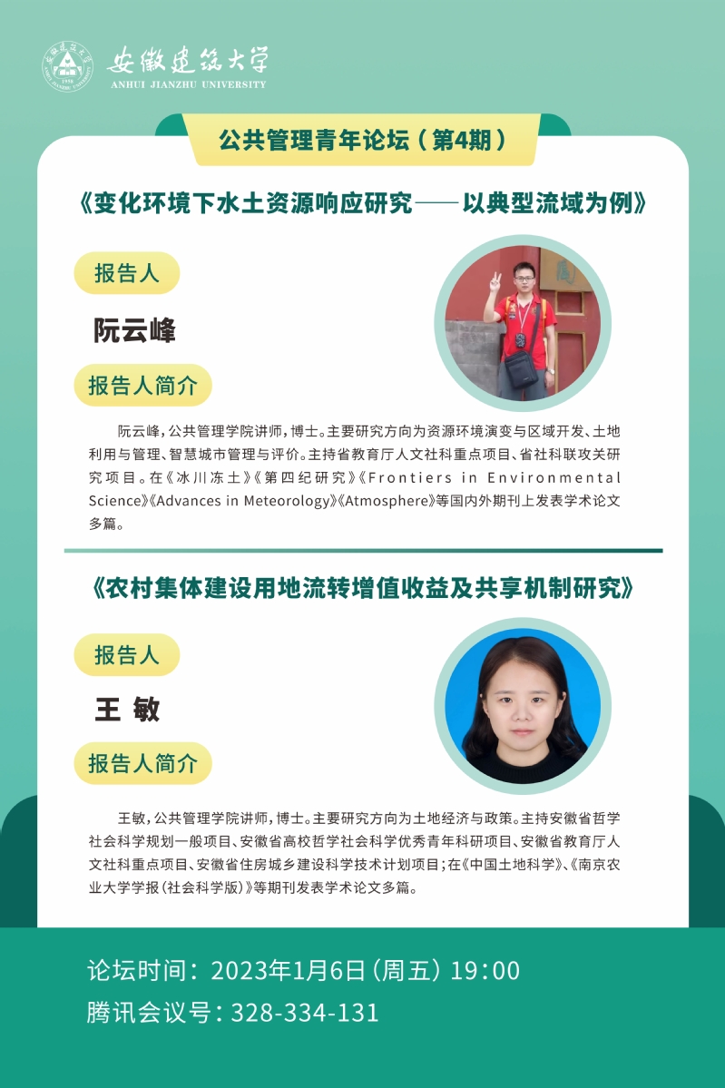 公共管理青年论坛(第4期):《变化环境下水土资源响应研究——以典型流域为例》、《农村集体建设用地流转增值收益及共享机制研究》