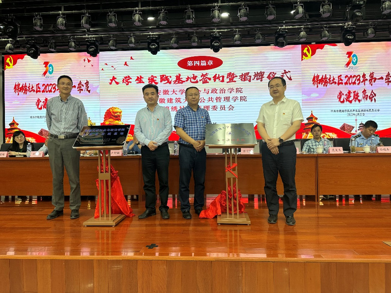 本网讯 为进一步加学校与地方沟通联系,拓宽学生实习实训渠道,4月20日,公管学院党委副书记马晓艳、副院长连瑞瑞土管系副主任项锦雯赴锦绣社区参加实习实训基地签约暨揭牌仪式。锦绣社区党委书记吴峰、管委会主任张自红、安徽大学社会与政治学院副院长徐理响等参与签约揭牌活动。