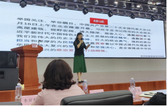 公管学院党委副书记马晓艳赴锦绣社区为200余名社区基层党员干部、辖区内企业党组织负责人作党的二十大精神宣讲。会上,马晓艳以《深学细悟聚力量 踔厉奋发新征程》为题,从深刻领会“党的二十大重大意义”“准确把握党的二十大精神实质”“基层党支部如何践行党的二十大精神”三个方面进行深入浅出、理论联系实际的分析讲解,提出基层党员干部应严格按照“一个信仰”“两个字”“三句话”“五个标准”,做政治上的明白人、群众的贴心人、发展的开路人、班子的带头人,立足岗位、对标对表、实干担当,做基层发展好榜样。