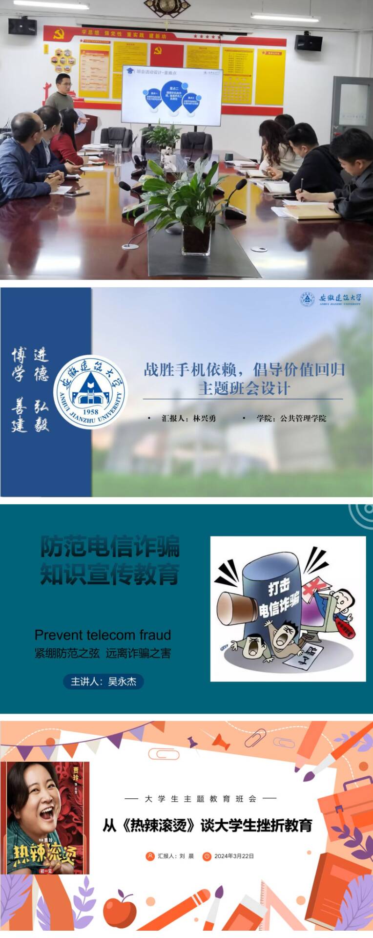辅导员围绕预防电信诈骗大学生挫折教育”“大学生手机依赖“二十大精神学习”网络安全等主题,精心设计班会内容,用心组织班会过程,巧妙采用PPT、视频、互动问答、小组讨论学习通等形式,综合展示班会教育思路、方法和效果,呈现了一堂堂寓意深刻、精彩纷呈的主题班会。在经过激烈的比拼后,评委综合考虑多方面进行评分,择优推荐辅导员参加校级决赛。活动最后,各评委对辅导员的精神风貌和扎实的理论功底与职业素养给予了充分肯定,并分别对辅导员在班会设计中的不足之处提出了合理建议。同时希望全体辅导员继续抓业务促能力、比学习促交流、强素质促工作,不断提高自身的理论素养、业务水平和综合能力。