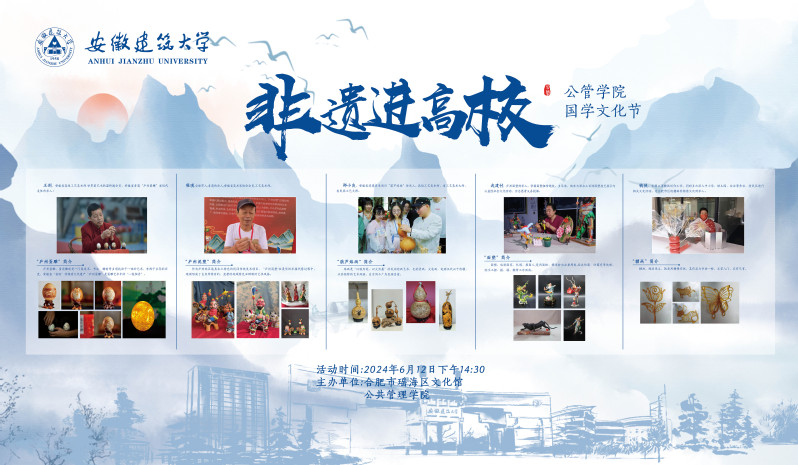 本网讯 领略名家风采,品味非遗魅力。为深入学习贯彻习近平总书记关于弘扬中华优秀传统文化的重要论述,营造传承国学经典、弘扬非遗文化的校园氛围,6月12日,由合肥市瑶海区文化馆和公管学院联合主办的“非遗进高校”活动走进安徽建筑大学金寨路校区,一个个独特的“非遗”项目、一件件精美的非遗作品,为师生带来了一场文化艺术盛宴。金寨路校区师生和国际教育学院部分留学生代表参加了本次活动。