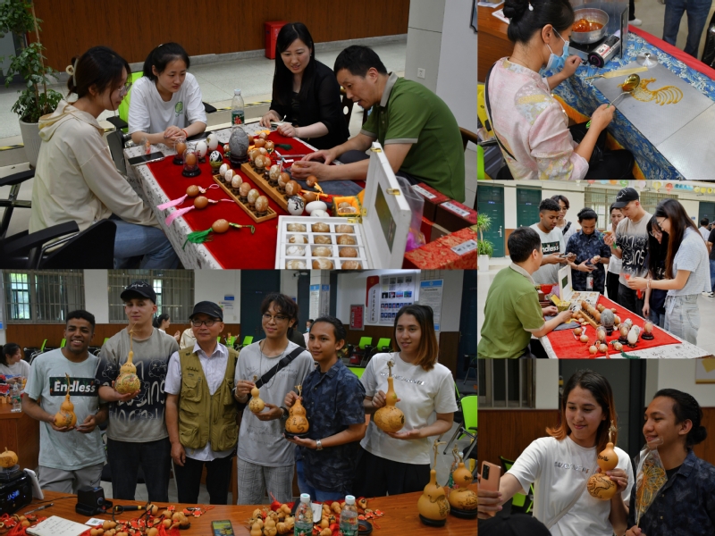 在葫芦烙画展位,安徽省非物质文化遗产葫芦烙画传承人郑小良正演示葫芦烙画,作品布局、制作工艺等让人惊叹,精湛的技艺、精美的图画、美好的寓意更是吸引了在场师生围观和尝试;一把单面刀片、一块简单的橡皮、一支不起眼的铅笔,安徽省非物质文化遗产庐州蛋雕传承人王剑便将手中普通常见的鸡蛋变成了令人惊叹的精美蛋雕艺术品;在庐州泥塑展位,关羽、李逵、孙悟空等人物形象栩栩如生,庐州泥塑传承人程琪也和同学们交流心得、分享感悟,同学们通过“捏、搓、印”等技巧来塑造自己的作品,气氛热烈而融洽;几团色彩鲜艳的面疙瘩,经安徽省庐州面塑非遗传承人武建付双手的捏、搓、揉、刻,倏忽间变出一个个活灵活现的人物,或是火眼金睛、聪明伶俐的孙悟空,或是裙带飘逸、眉目如画的仕女,让在场师生惊叹不已,有的留学生跃跃欲试,感受中华优秀传统技艺之美;在糖画展位,合肥市区级糖画传承人钱侠正在和同学们交流着,雄鸡、爱心、蝴蝶……一件件糖画作品被师生拿在手中,甜香四溢,正如文化浸润沁人心田。