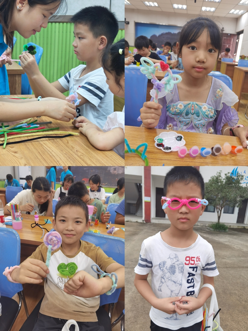 扭扭棒通过独特的扭曲,可以创造出形态各异的艺术作品。志愿者介绍了扭扭棒制作的基本原理,鼓励孩子们发挥创造力与想象力,制作独一无二的手工艺品。花朵、戒指、王冠、眼镜,一件件扭扭棒作品在通过孩子们灵巧的小手呈现出来,培养了孩子们的动手能力,并引导孩子们在今后的生活学习中转移压力,在创作中发现美和表达美。