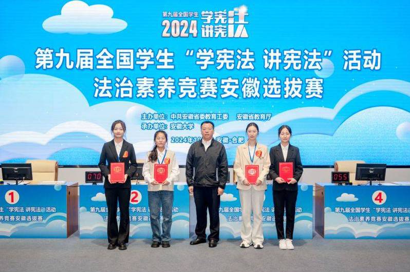 本网讯  10月15日,安徽省第届学“学宪法 讲宪法”竞赛在安徽大学圆满落幕,我校公管学院2022级法学专业王雨鑫同学荣获法治素养竞赛省赛一等奖,2023级法学专业房浩琳同学荣获法治素养省赛三等奖,延续我校连续四届荣获省赛一等奖的佳绩;2022级法学专业赵芯蕊同学荣获演讲比赛省赛二等奖2022级法学专业吴童林同学荣获演讲比赛省赛三等奖,实现了学校在此项赛事新的突破。