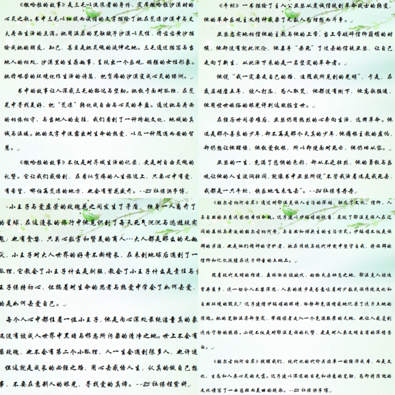 从矗立着群山,流淌着溪水,拥有美好人物与纯净风土人情有如吟唱一首田园牧歌,阅读时如游览山水画卷的《边城》;到通过少平、少安兄弟两人的成长经历,展现了从农村到城市,从贫穷走向富裕的过程中,人们如何面对生活的艰辛、爱情的考验以及个人理想的追求的《平凡的世界》;再到文笔朴实而深沉,带有一种独特的生命力量,阅读时常常被直面困境、顽强生活的精神所打动,用残缺的身体,说出了最为健全而丰满思想的《我与地坛》……