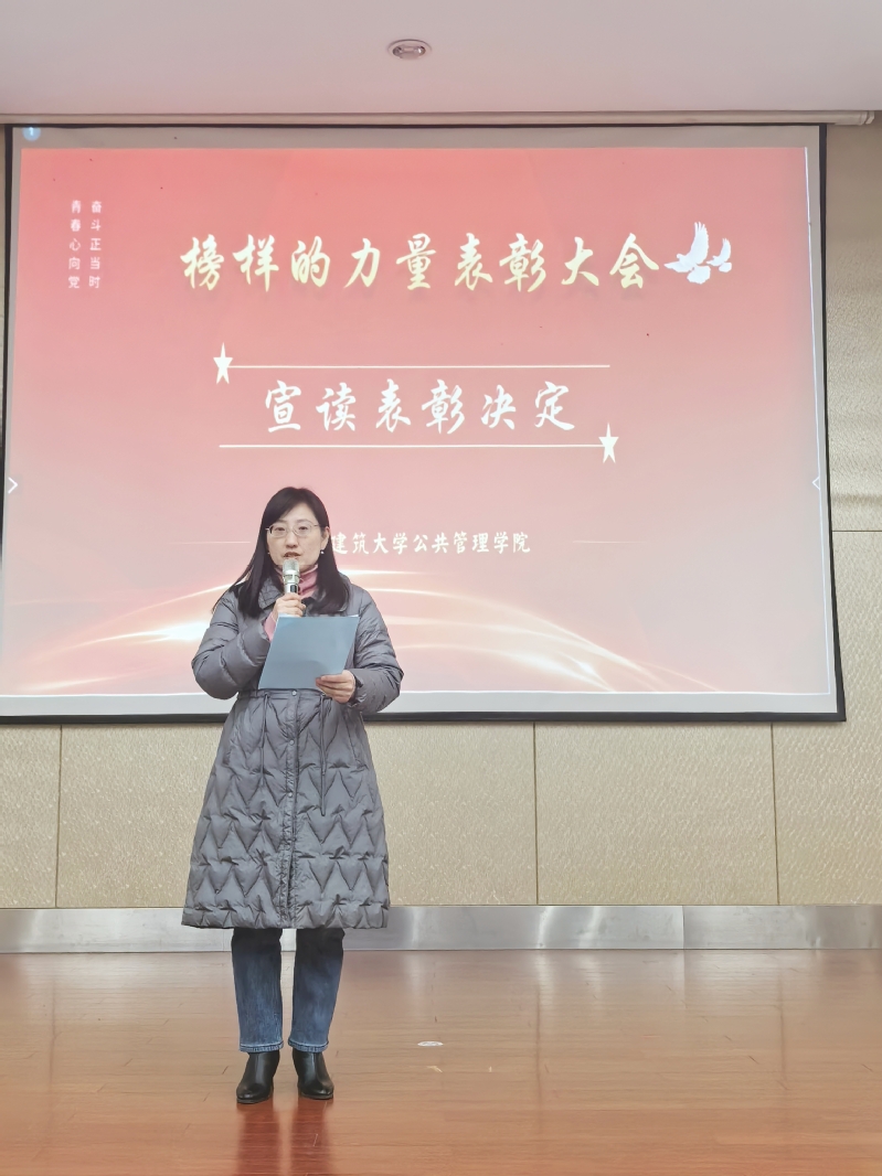 挺膺担当正青春,奋楫笃行向未来。大会伊始,一段视频带我们回顾了2024年公管学院学生工作的点点滴滴,同学们在专业学习、学科竞赛、志愿服务、社会实践、学生活动等方面的一张张照片、一段段视频,诠释了公管子积极进取、乐学好进的精神风貌,赢得了现场师生的阵阵掌声。随后,学院党委副书记(主持工作)马晓艳宣读表彰决定,她希望受表彰的同学戒骄戒躁,以身作则,百尺竿头更进一步,力争取得更大的成绩;也希望所有同学见贤思齐,勇于超越,扎实锤炼一技之长,全面提升综合素养。