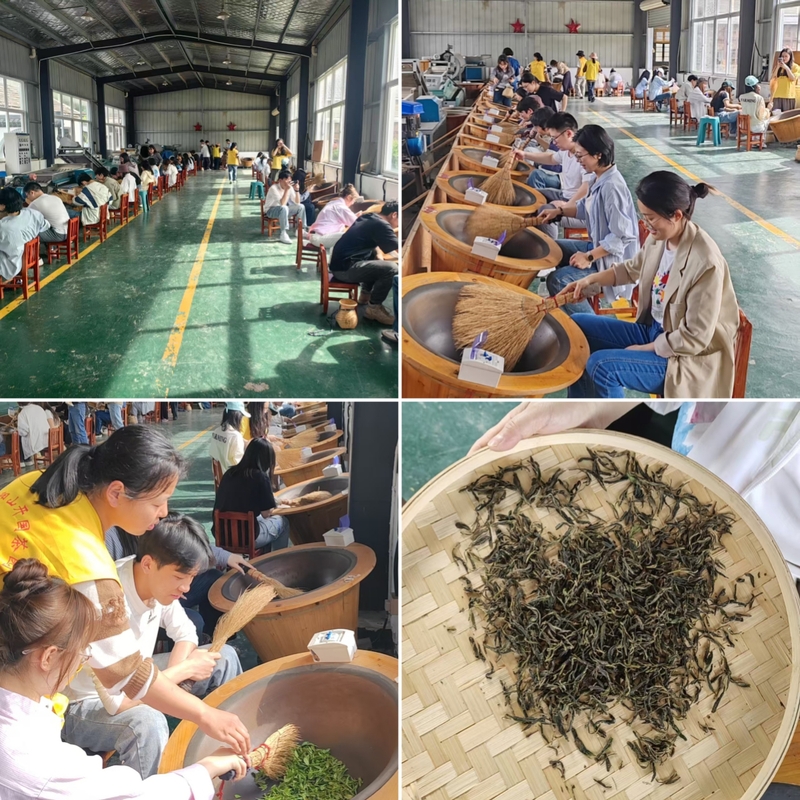 从鲜叶到茶香,师生们走进古尖香茶场,沉浸式体验非遗制茶技艺。在手工炒制车间,老茶工演示舒城小兰花传统工艺:生锅100℃杀青去青草气,熟锅60℃揉捻塑形,竹把扫扬间茶香渐溢。师生分组操作电炒锅,以“搭、抹、推、抛”手法为茶叶做形,指尖感知芽叶从柔软到挺直的变化,体悟“火候定品质”的匠人精神