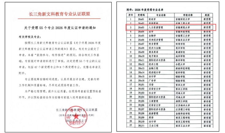 本网讯 近日,长三角新文科教育专业认证联盟发布《关于受理55个专业2026年度认证申请的通知》,经联盟严格审核,公管学院人力资源管理专业代表安徽建筑大学文科专业成功入选,标志着我校在新文科建设征程上迈出重要一步。该联盟于8月25日召开2026年度受理专业骨干教师培训会,公管学院副院长连瑞瑞与人力资源管理专业7位教师参加。