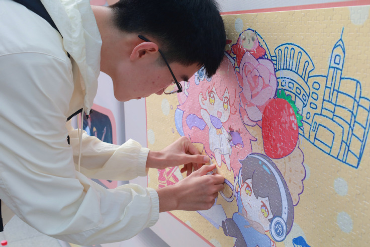 新生在学院拼图墙前挑选心仪的标语牌,绽放青春洋溢的笑容,拍下“开学第一张照片”。精心设计的拼图墙上,也留下了新生们亲手放置的每一块拼图。