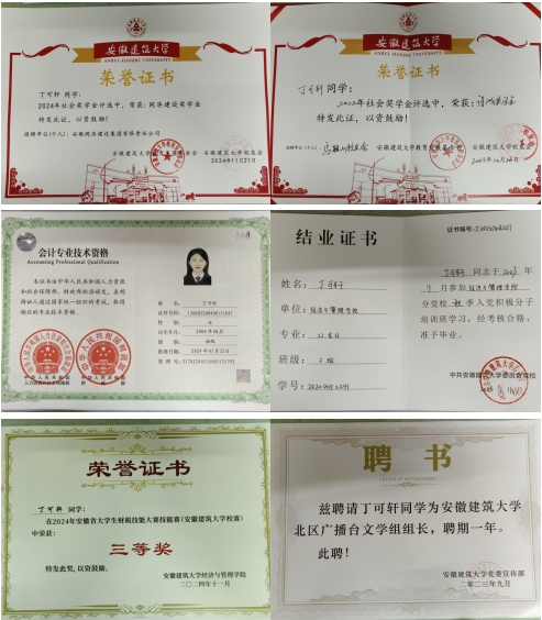 丁可轩,安徽建筑大学经济与管理学院2022级会计学专业学生,中共预备党员,荣获社会奖学金、校二等奖学金、“校三好学生”、“校优秀共青团员”等荣誉称号。
