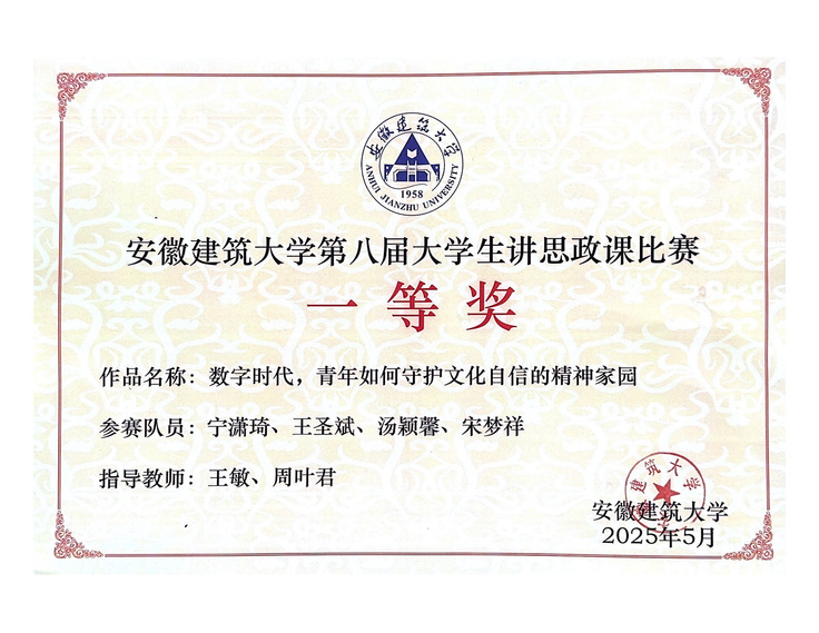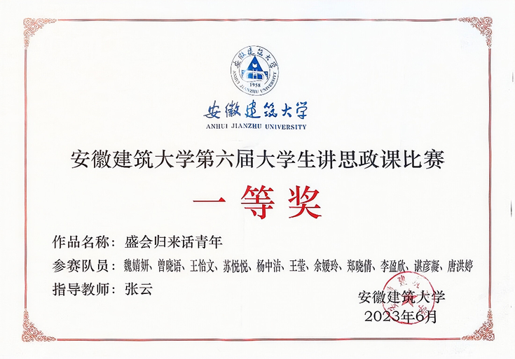 面对新时代的新要求,学院不断创新思政教育的方式方法,通过“菁琯”青年宣讲团平台深入挖掘社会主义先进文化的时代价值。将社会主义先进文化融入思政课堂,采用案例分析、互动讨论、社会实践等多种形式,让青年学子在参与中感受社会主义先进文化的魅力,理解其背后的深刻内涵。在安徽建筑大学大学生讲思政课比赛中,宣讲团成员屡获佳绩,展现了其深厚的理论功底和出色的创新能力。其中,2023年魏婧妍、张青怡两位同学荣获一等奖,魏婧妍同学荣获皖中片区赛三等奖;2024年曾祥玮荣获二等奖,李家乐等同学荣获三等奖;2025年宁潇琦和徐海波两位同学均荣获一等奖。他们用同龄人的语言、切身的体验和青春的感悟,将复杂的理论转化为生动的案例,将抽象的概念转化为鲜活的实践,让思政课堂真正“活”起来、“动”起来、“潮”起来,引领了思政教育的潮流。
