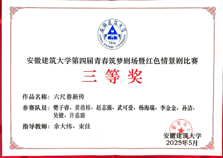在安徽建筑大学第四届青春筑梦剧场暨红色情景剧比赛中,作品《星火燎原》荣获二等奖,学院荣获最佳组织奖。让革命先辈的理想信念与家国情怀在舞台上穿越时空,与当代青年进行了一场心灵的对话,使革命文化从抽象概念转化为可体验、可感知的精神洗礼,在学院范围内营造了浓厚的红色文化氛围,激发了青年学子的爱国情怀和使命担当。