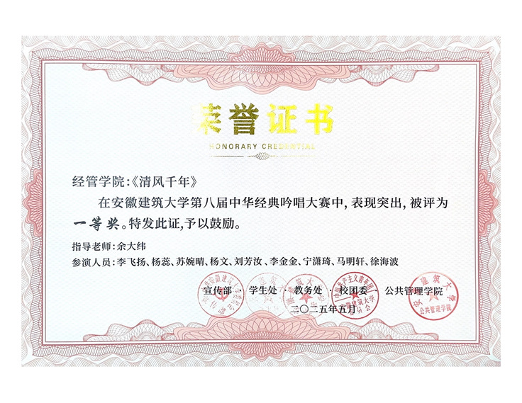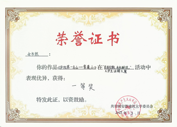 在2025年“美丽安徽我来解说”大赛中,李晗玥、余书然、任雨、王圣斌、李金金五位同学更是凭借出色表现勇夺一等奖,周逸昕获二等奖,徐海波等五位同学获三等奖,为宣讲团再添光彩一笔。正如团队成员在赛事阐述中所言:“我们站在徽州古村落的天井之下,不仅看见飞檐斗拱的建筑美学,更解码出‘四水归堂’所蕴含的聚财守德、耕读传家的现代伦理价值。”这种将地域文化基因与社会主义核心价值观相衔接的实践,使传统文化成为滋养青年家国情怀的“精神根系”。